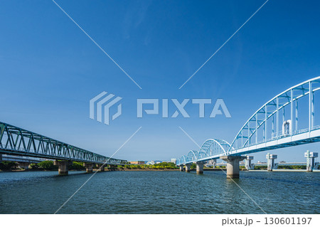 淀川河川公園長柄地区を通る水管橋と阪急千里線の鉄橋 大阪市