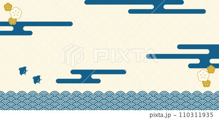 背景素材:日本の伝統的な柄を集めた、海を飛ぶ千鳥がいる風景