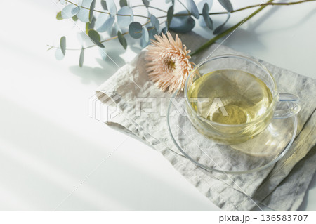 余白のある白背景 木漏れ日のハーブティーと花