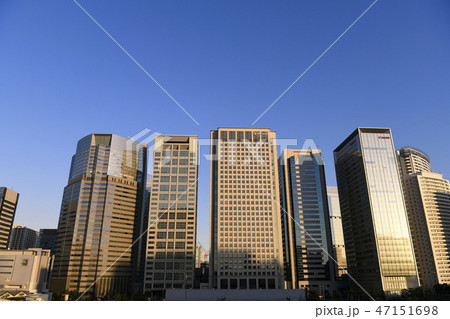 日本の東京都市景観 夕陽に映える品川のオフィスビル群を望む