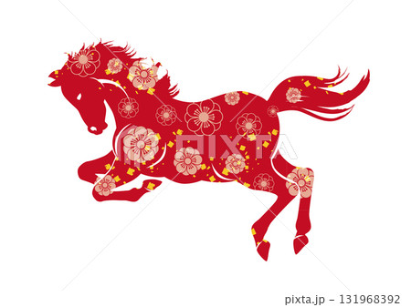 午年 年賀素材 紅白の午と梅の花 金色バック