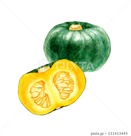 かぼちゃ 緑 野菜 断面 水彩 イラスト