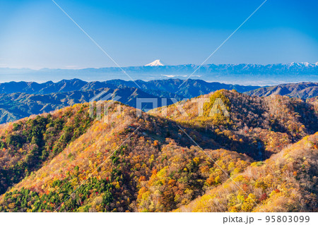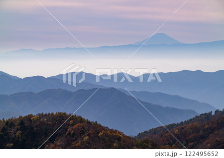 (栃木県)奥日光半月山駐車場から望む、紅葉した山並みの向こうに富士山
