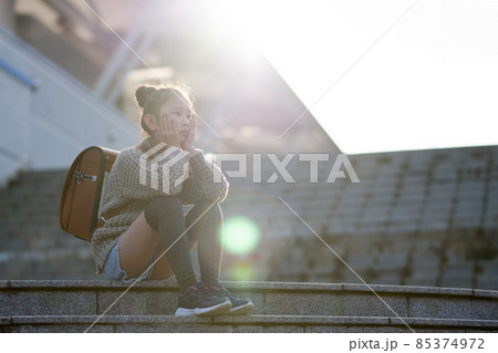 階段に座って遠くを見つめる子供