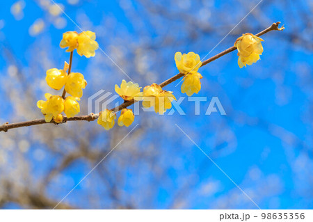 早春に黄色い花を咲かせる落葉低木のロウバイ