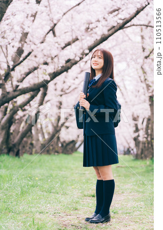 桜を背景に卒業証書を持つ高校生(女子高生)