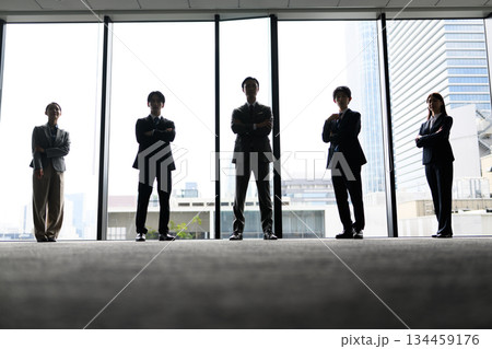 窓際に並ぶビジネスチームのシルエット