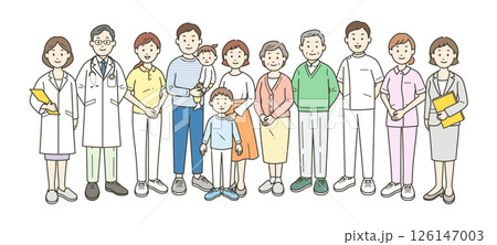 地域の社会福祉を支える医師と看護師と介護士とケアマネージャーと栄養士が集合した全身イラスト