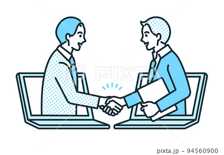 オンライン上で取引先と握手をするビジネスパーソンのイラスト素材