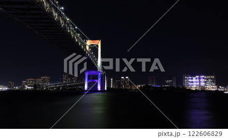 レインボーカラー(虹色)に特別ライトアップされたおレインボーブリッジの橋脚、橋の右側にフジテレビ本社