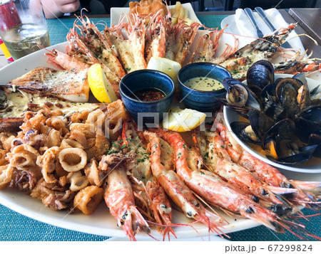 豪華な海鮮料理の大皿(南アフリカ,ケープタウン)