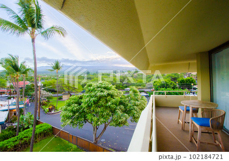 ハワイ島のリゾートホテル そのベランダからの景色 フアラライ山を遠くに臨む