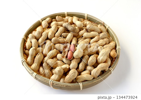 白背景の竹ざるに盛った沢山の殻付き落花生