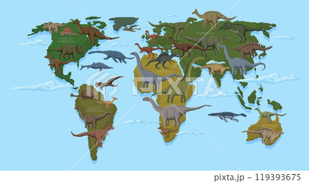 Dinosaurs infographics in 8 bit retro pixel art style. Vector educational world map with prehistoric dino species placed on the continents North America, South America, Africa, Eurasia and Australia