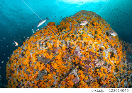 Orange cup coral cover on pinnacle with a school of fish at 8 mile rock near Lipe Island, Thailand