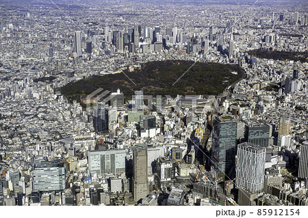 渋谷駅上空から代々木公園方向を空撮