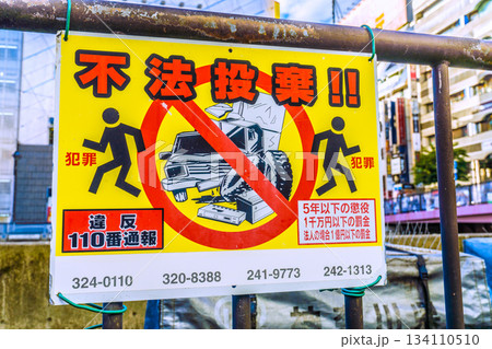 日本の横浜都市景観 師走。横浜駅前。「不法投棄」はダメ…奥は、ビックカメラや横浜ビブレ、南幸橋
