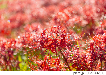 岐阜県海津市南濃町津屋 雨上がりの水滴をまとった曼殊沙華(彼岸花)が土手を真っ赤に染める津屋川堤防