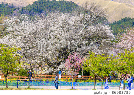 一心行の公園から全景風景 一心行の大櫻 阿蘇の山並み景色 Isshingyo Sakura
