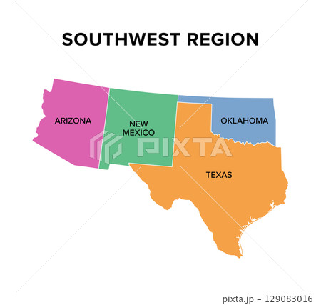 Southwest region of United States, colored map. Also Southwestern United States, American Southwest, or simply Southwest, a geographic region, consisting of Arizona, New Mexico, Oklahoma, and Texas.