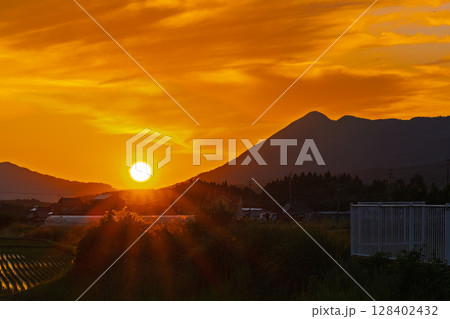 美しい田園と阿蘇の山並みに映える夕日 (見晴台駅)(南阿蘇村)