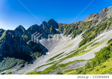 北穂高岳の登山道から見上げる前穂高岳と涸沢カール 北アルプスの北穂高岳登山(新聞、雑誌用)