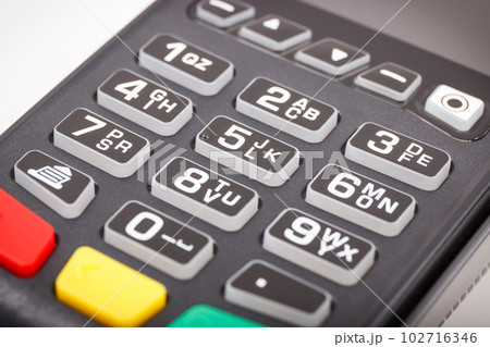 Payment terminal, credit card reader using for cashless paying. Finance concept