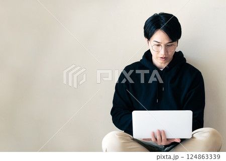 壁際でパソコンを使う男性