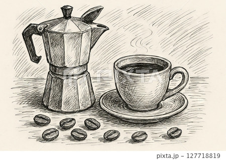 Vintage coffee sketch illustrating cup and pot with coffee beans on a simple background. concept of morning beverage, cafe experience, classic drink illustration.