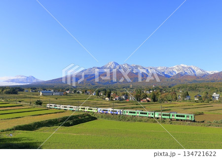 残雪の甲斐駒ヶ岳と小海線ローカル列車