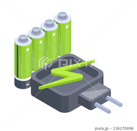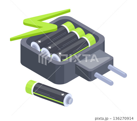 Isometric alkaline batteries charger. Charging accumulators, electric charging equipment 3d flat vector illustration. Charging batteries on white background