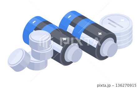 Isometric charged batteries. Alkaline accumulators, power electricity elements flat vector illustration on white background