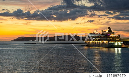 夕暮れの博多港に停泊中の大型客船アドラマジックシティ