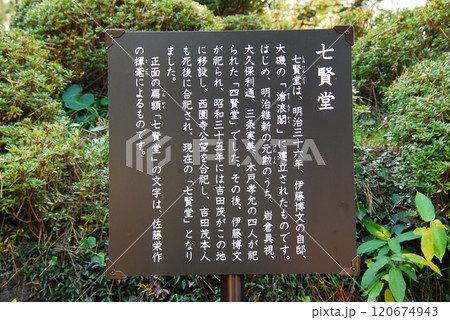 旧吉田茂邸敷地内にある「七賢堂」の説明板(神奈川県中郡大磯町)