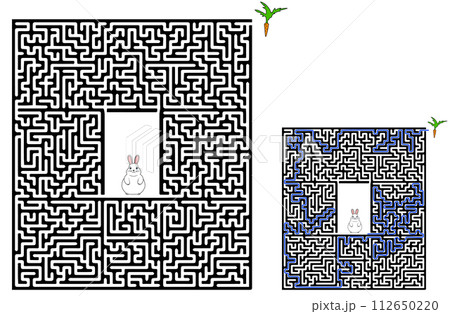 Big labyrinth with rabbit inside. Find the way out logic game. Hard difficulty level maze with bunny