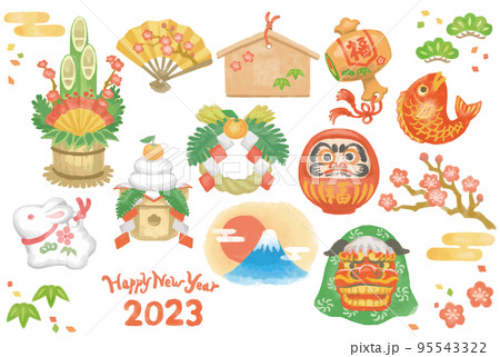 水彩風、2023年お正月のイラスト素材。年賀状などに。ベクター素材。