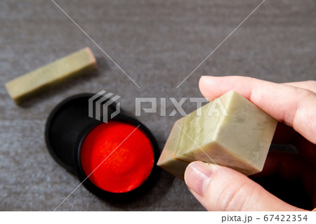 篆刻刀で石を彫った篆刻印。石の篆刻と朱肉。書画などに押す落款印・印章・サイン。