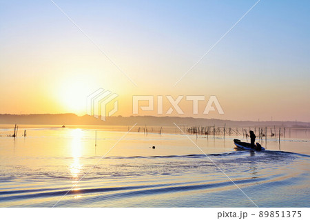 千葉県 夜明けの印旛沼をボートが行く