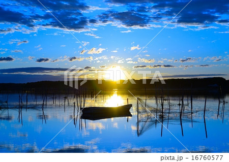 小舟のある夜明けの印旛沼の風景 雲と湖面のリフレクション