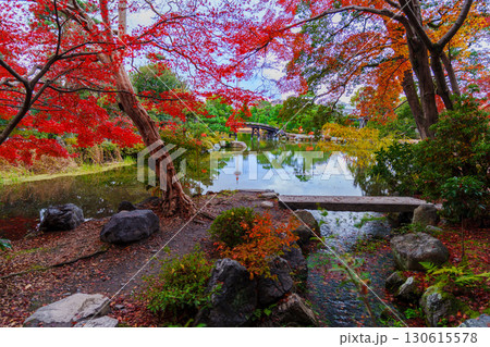 京都 渉成園丹楓渓 印月池の侵雪橋