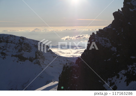 Majestic mountain peak above the clouds with snow-capped peaks and warm colorful sky at sunrise.