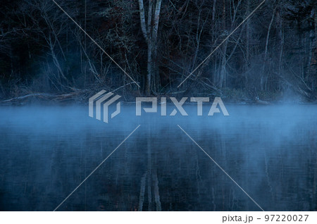 朝靄の漂う夜明けの湖畔の森。北海道の屈斜路湖