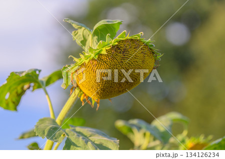 A closeup view of a mature sunflower head set against a clear blue sky, which is stunning