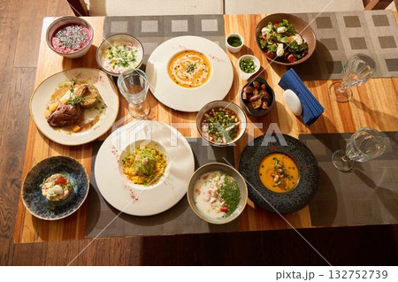 An Exquisite Dining Experience Featuring Varied Dishes Presented on a Rustic Table