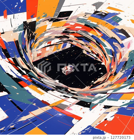 カラフルな渦に包まれた孤独な構造物の抽象アート