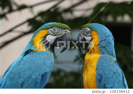 コンゴウインコのペアが向かい合う鮮やかな姿 カラフルで存在感のある鳥のイメージ