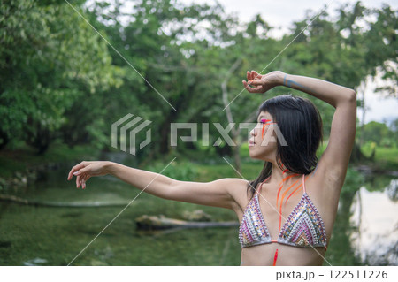 A vibrant portrait of a fashionable woman in colorful attire. Her strong expression captivates. The neon backdrop enhances the cultural essence. Generative AI