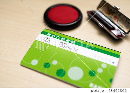 緑色の銀行通帳と赤い印鑑ケース お金 貯金