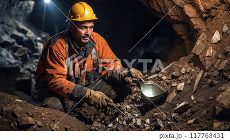 Miner working underground, focused on extracting minerals, illuminated by a headlamp in a dark tunnel.