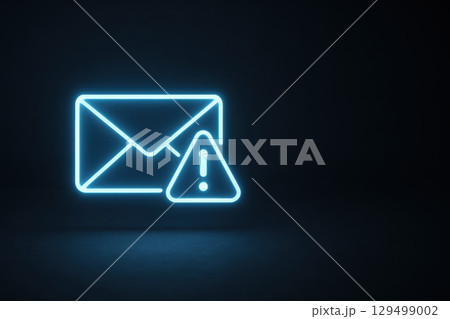 Neon email icon with warning sign represents cyber threat and phishing attack risk in digital security and online fraud prevention for cybersecurity and spam protection